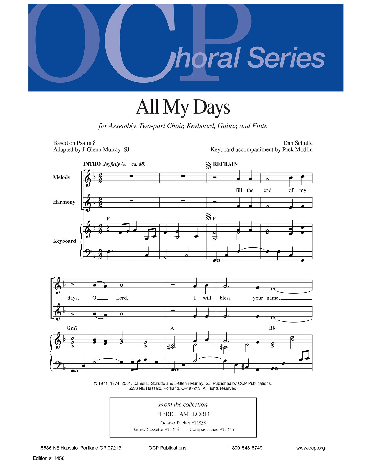 "All My Days" is one of Dan's most popular liturgical compositions from the St. Louis Jesuits years. The texts brings our hearts closer to God. Based on Psalm 8, this piece is a nice choice for themes of God_x0019_ s love for us, praise, and thanksgiving. It also works very nicely for marriage and Communion. It is arranged for 2-part choir and includes a flute part.