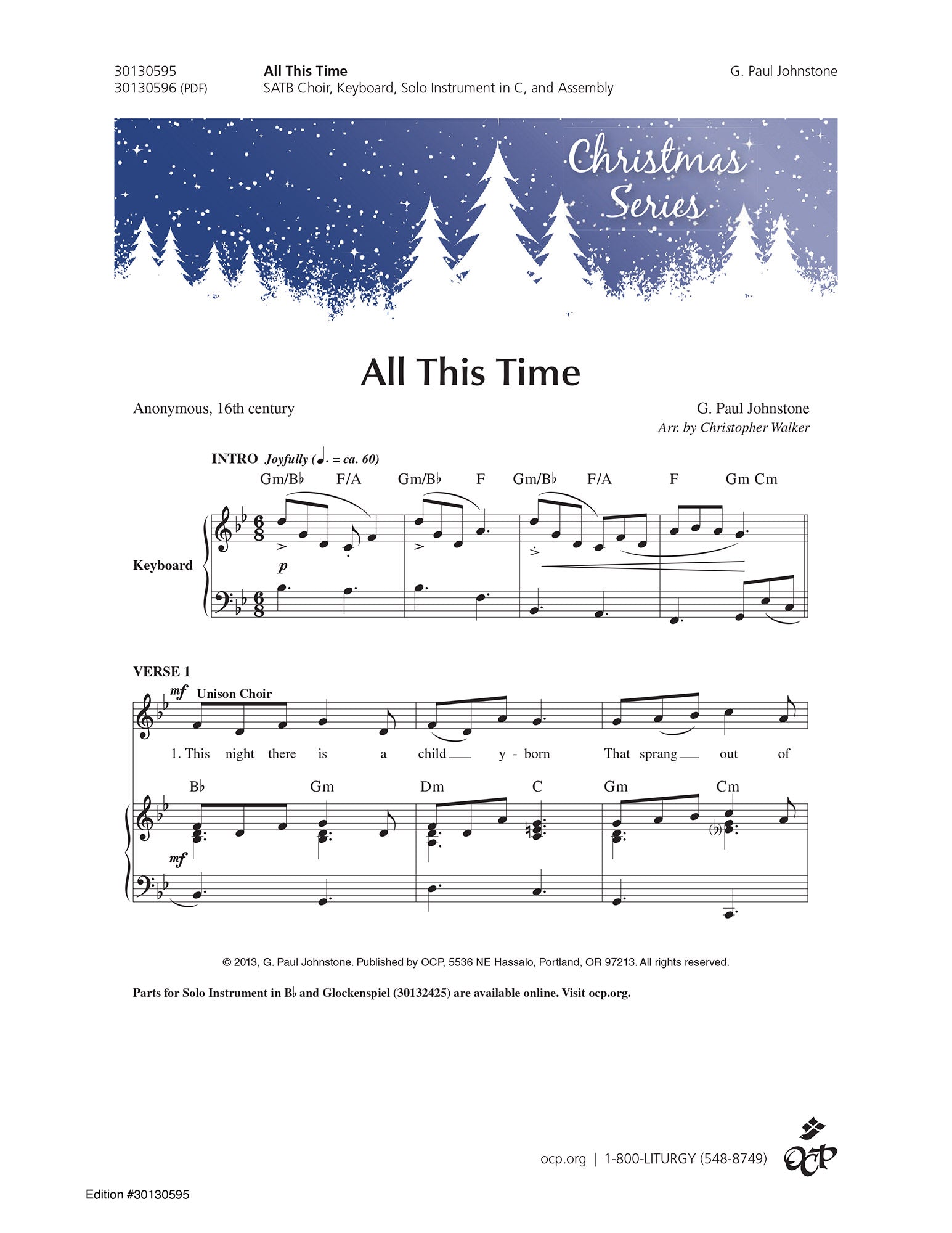 With music to match the beauty of this 16th century text, _x001C_ All This Time_x001D_ is a great choice for the Christmas season. Arranged by Christopher Walker for SATB choir, it also has a part for Solo Instrument in C. Written in a 6/8 meter adds to the joy of the season as the song proclaims Verbum caro factum est (the Word was made Flesh). There are also parts for Solo Instrument in B and Glockenspiel (30132425) which are available online.