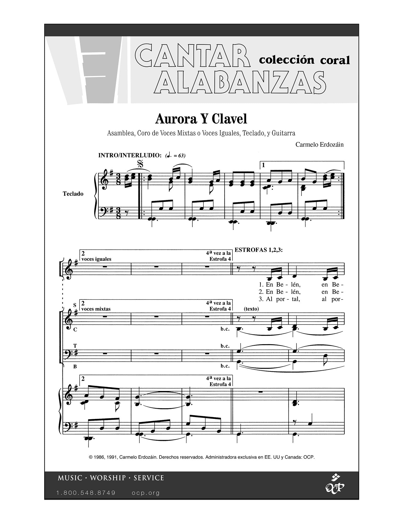 Written by one of the most prolific composers in the Hispanic world, _x001C_ Aurora y Clavel_x001D_ is a joyous yet gentle hymn telling the Christmas story, presenting Jesus as a Carnation flower born at dawn to the virgin Mary. Written for SATB choir or for 3 equal voices, keyboard and guitar, this would make a lovely part of the repertoire sung before Christmas Mass at midnight.