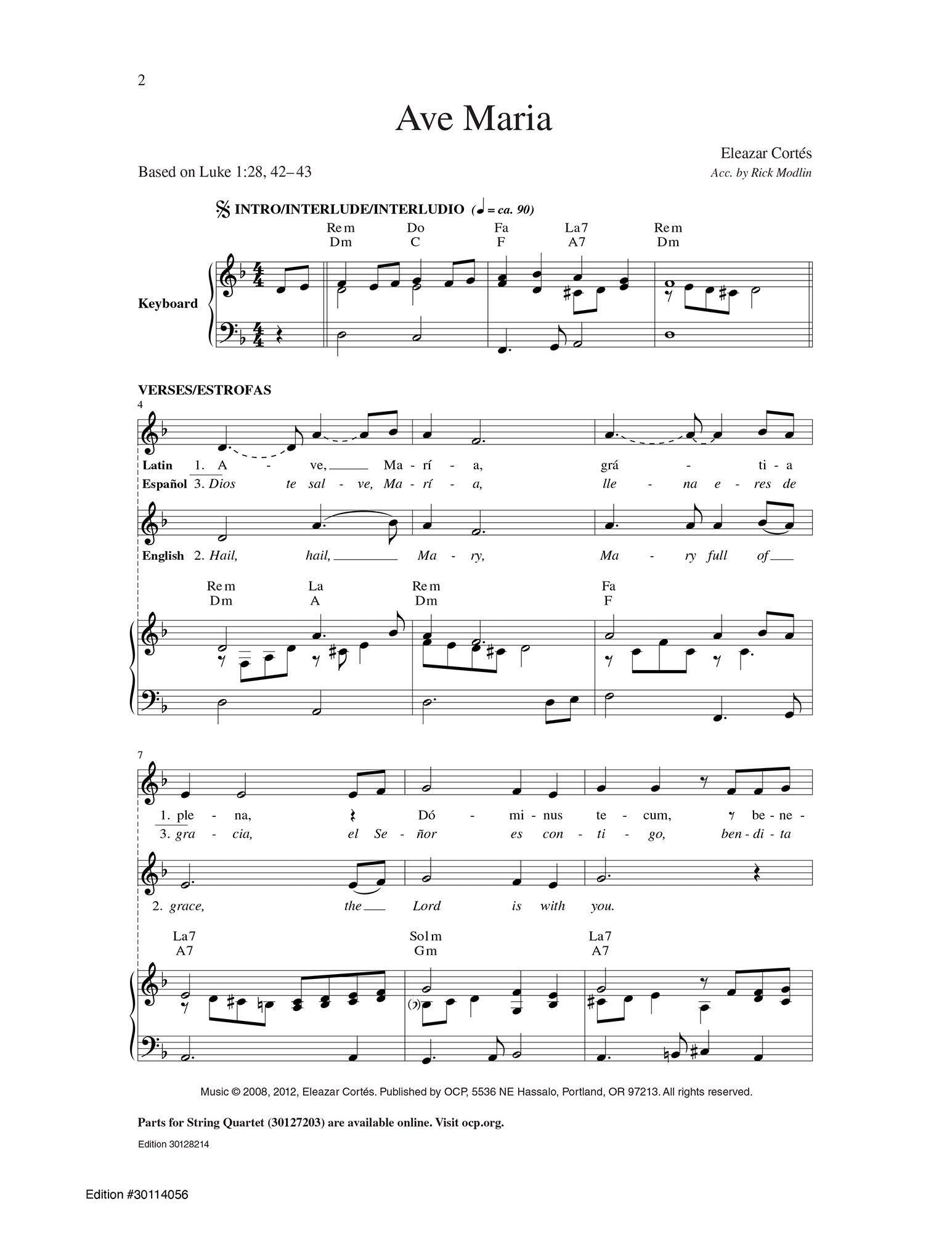 The Ave Maria prayer is central to the Catholic faith. The Church honors the Virgin Mary through many Marian devotions such as the Rosary. Customarily sung by a soloist, Cortés has composed a setting of the Ave Maria that can be sung in Latin, Spanish or English by choir and congregation. It may be accompanied by guitars or also organ, piano and small orchestra.