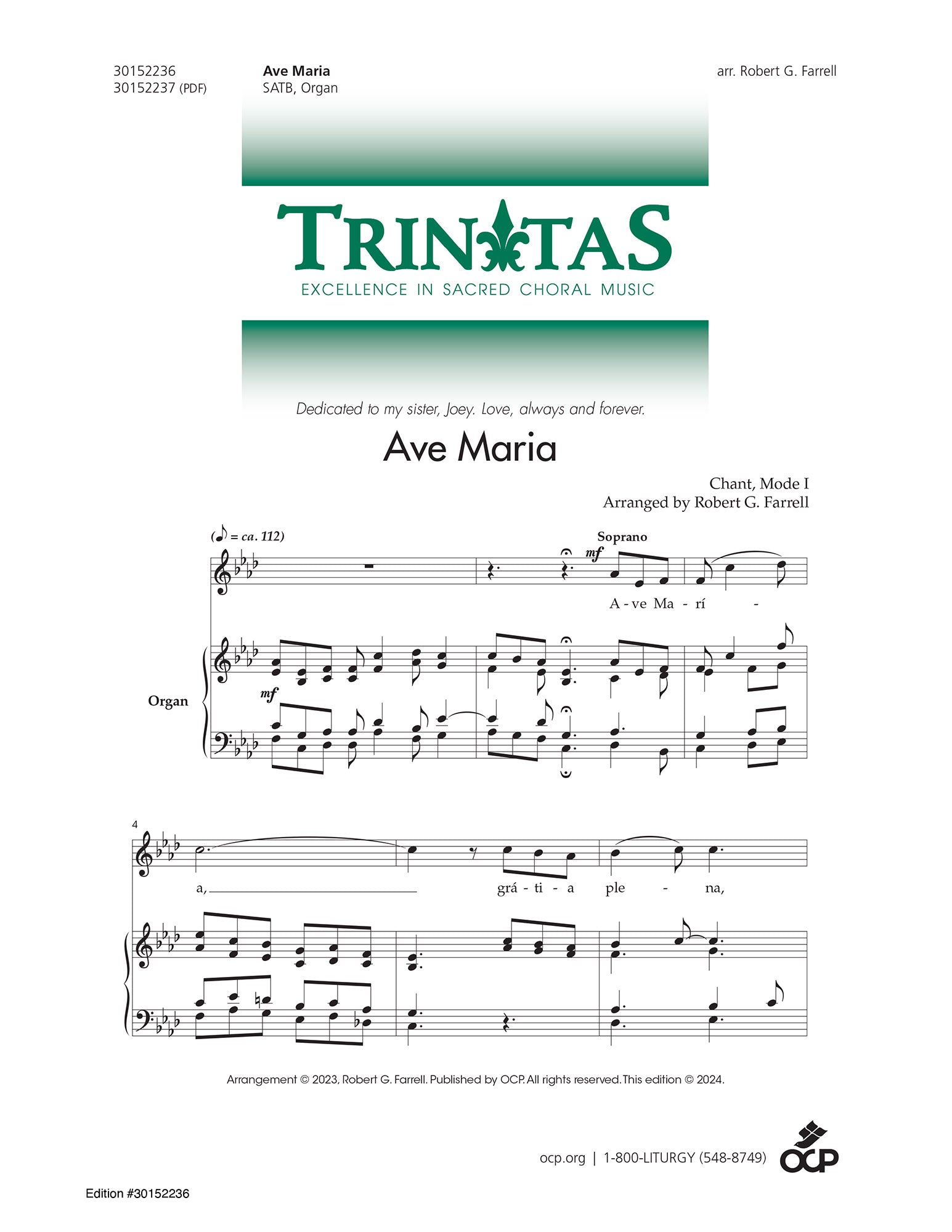 This new setting of the Ave Maria for SATB chorus and organ enhances the original chant, adding rich harmonies and polyphonic textures. Though not an easy piece, the skillful voice-leading makes this accessible for moderately experienced choirs. In key phrases, Farrell uses parallel motion to evoke the effect of ancient organum. Other times, the texture is imitative, to underscore the meaning. When the organ accompanies the choir, it is supportive, and for rehearsal of the most intricate a cappella section, an organ reduction is provided.