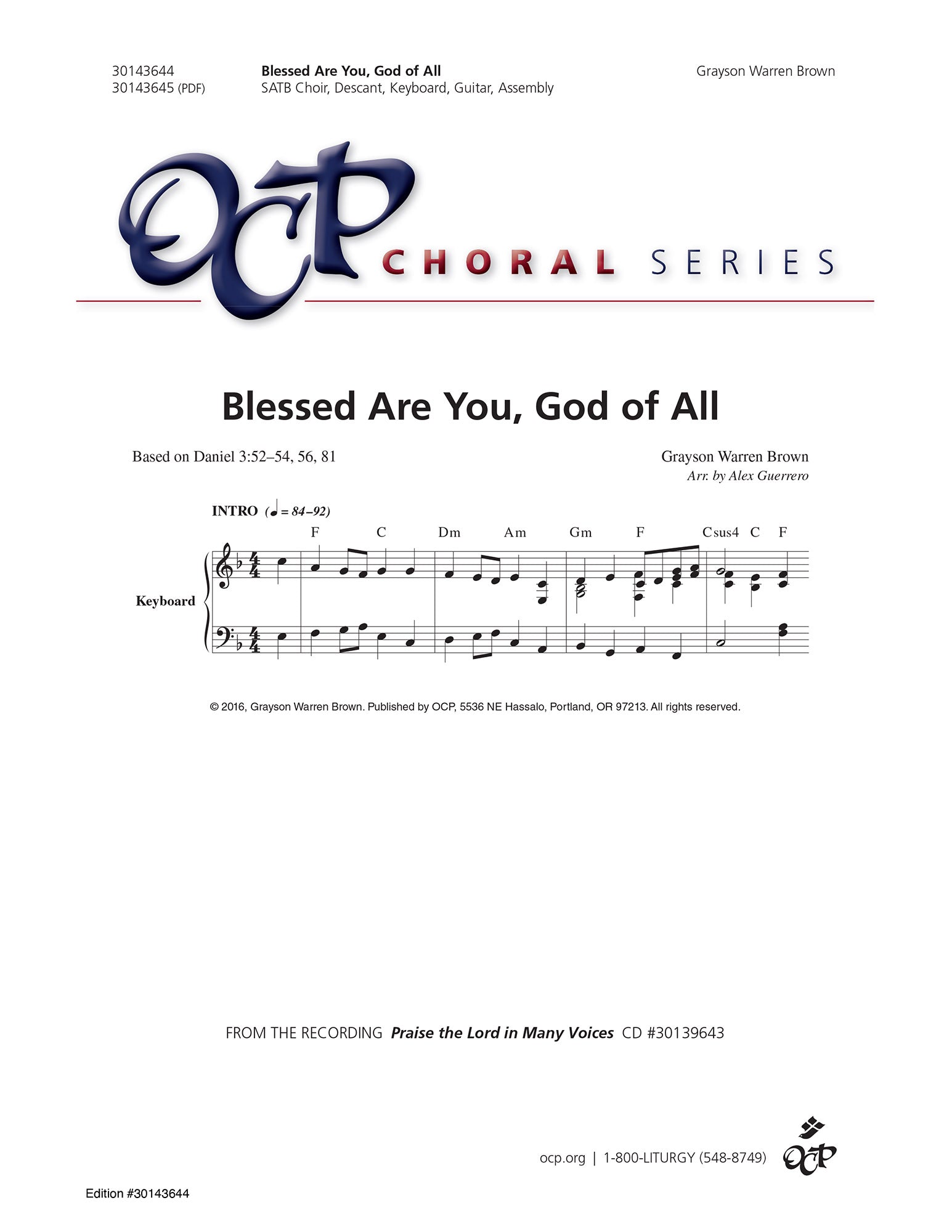 "Blessed Are You, God of," from Warren Grayson Brown_x0019_ s latest release, Praise the Lord in Many Voices, is now available for SATB choir with descant! The song references Daniel 3, praising the Lord and His creation, while exploring a trio of tonal centers. Working equally well with organ or keyboard (both are used in Grayson_x0019_ s recording), the song also plays surprisingly well on guitar. Altos will love being giving their chance to shine as they present the melody in the second verse.