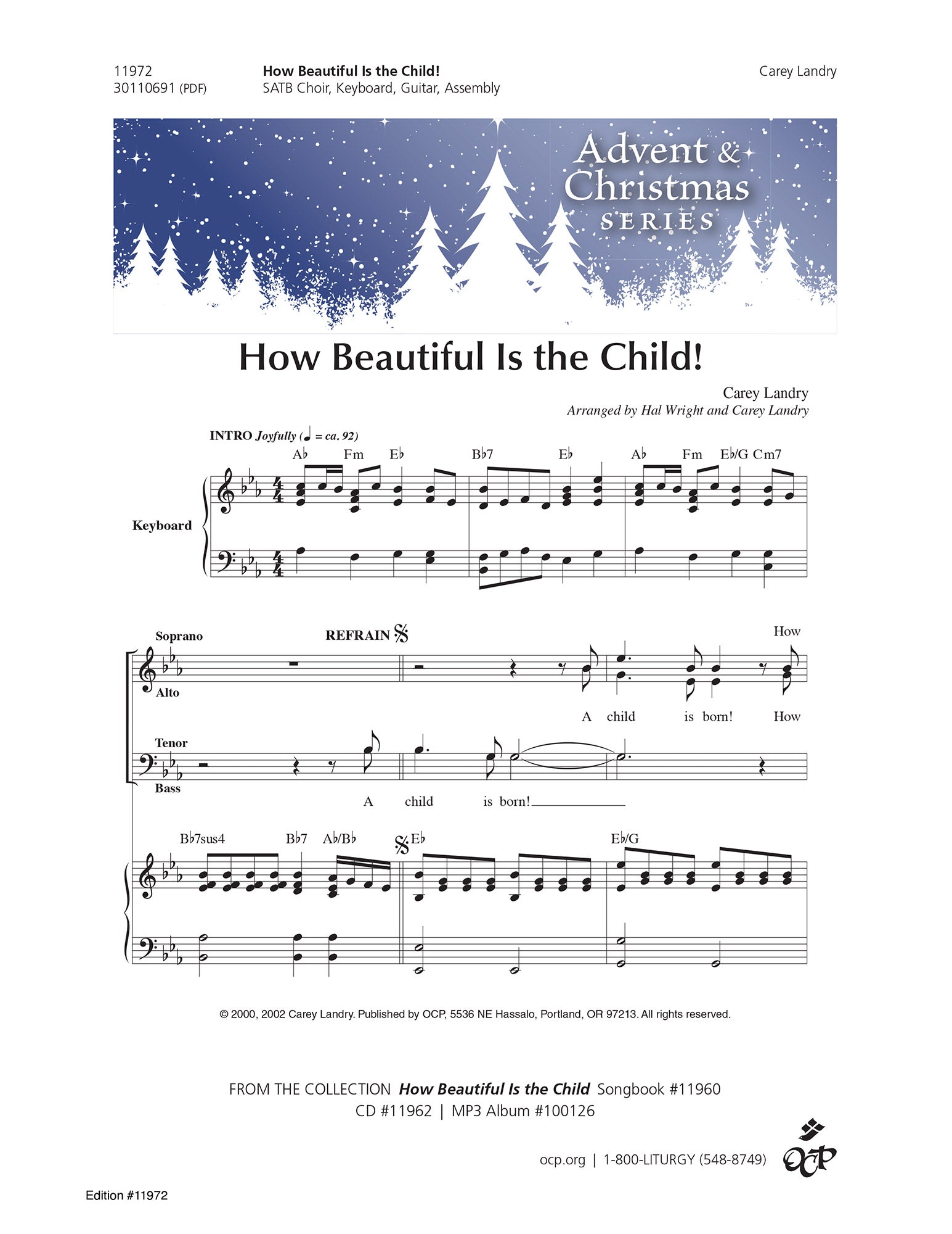 Though this setting for SATB choir, keyboard, guitar and assembly is not specifically intended for children as many of Landry_x0019_ s pieces are, it is informed by a similar sensibility: with a tuneful diatonic melody, jaunty foursquare rhythm, regular phrase lengths, and straightforward choral writing, this song will appeal to singers of all ages. Its lyrics focus on not only on Jesus_x0019_ s birth but also the coming of the Magi, so it can be sung throughout the Christmas season.