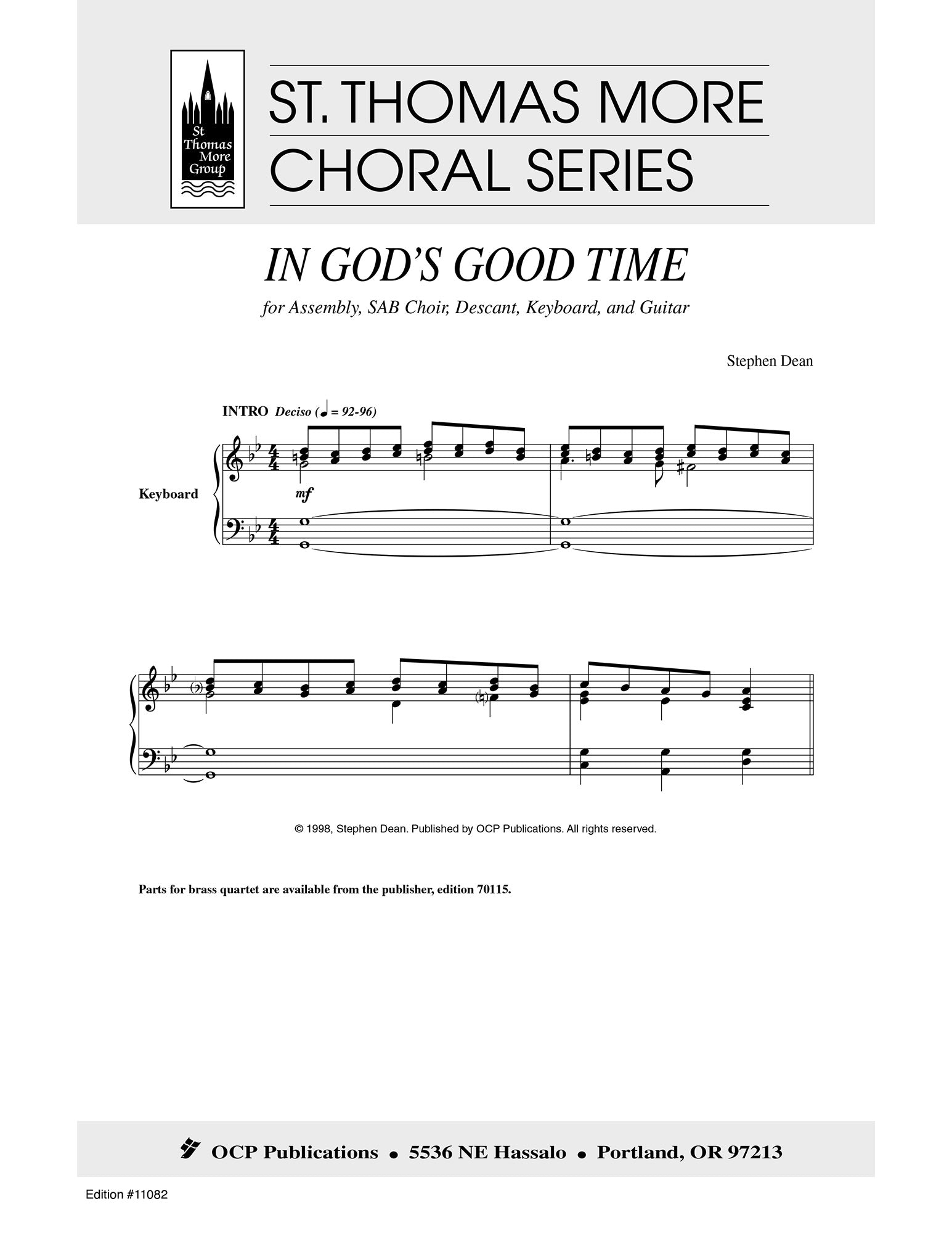 Full of rhythmic forward drive, this song has an upbeat, decisive nature; it will serve well as a gathering or closing hymn, especially the latter. Scored for SAB choir with descant, keyboard, and guitar with parts for brass quartet available as a separate download, this song deals with topics of faith, hope, and peace. Snappy syncopations pace the melody throughout, which fluidly oscillates between the tonic minor and relative major, but is always bookended by the tonic major.