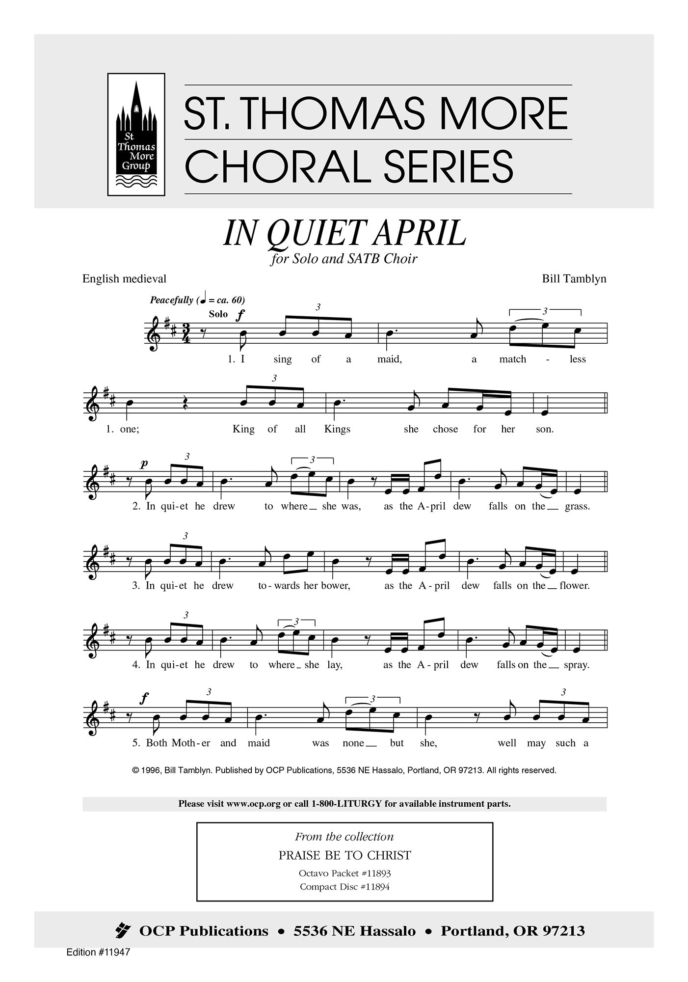 Peaceful and meditative, this gentle and brief Marian anthem is based on a medieval English text and employs the Mixolydian mode to evoke this ancient provenance. It begins with an unaccompanied solo voice, which is joined after a time by a cappella SATB choir, who, at first, simply sing in unison. The piece slowly builds in texture to encompass four independent voices, closing again with the solo voice, but now supported by a wordless pedal point in the chorus.