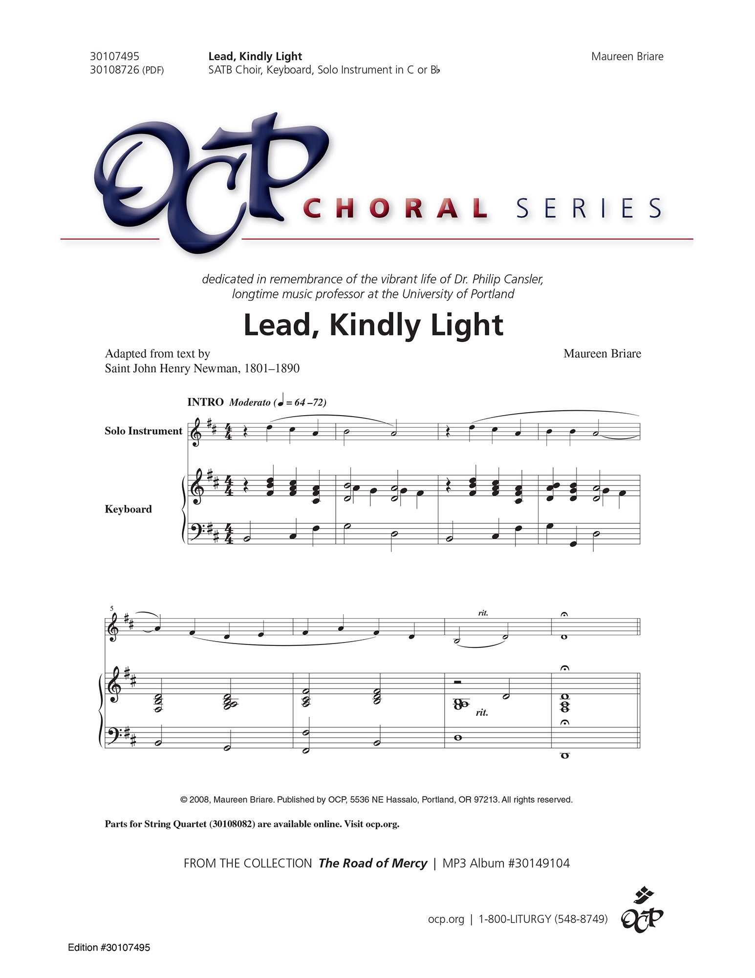 This lyrical, wistful choral anthem for SATB choir with keyboard accompaniment sets an adaptation of a text by Blessed John Henry Newman. Because of its themes of comfort, light, and trust in God, it will work liturgically for funerals and Masses during November. A solo instrument (in C or B-flat) enhances the texture and parts for string quartet are available online for separate download. Set in B minor, it moves along in a flowing 4/4 meter.