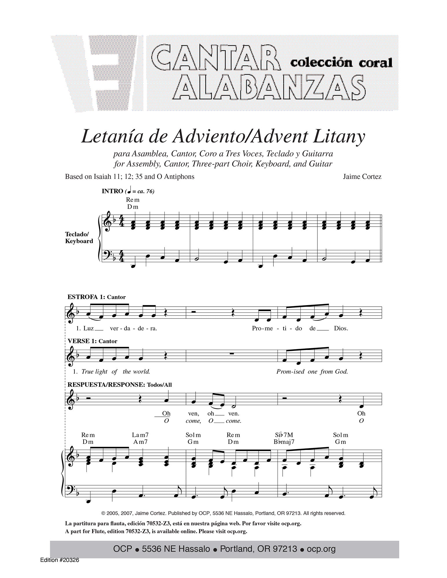 From Cortez_x0019_ s collection, Adviento, this seasonal litany, scored for three-part choir, keyboard, and guitar, is powerful and prayerful. Based on _x001C_ O Come, O Come, Emmanuel,_x001D_ the assembly sings _x001C_ O come, O come_x001D_ after each of Christ_x0019_ s traditional Advent titles. The litany is presented in both English and Spanish (verses and refrain are both bilingual). An optional flute part is available separately.
