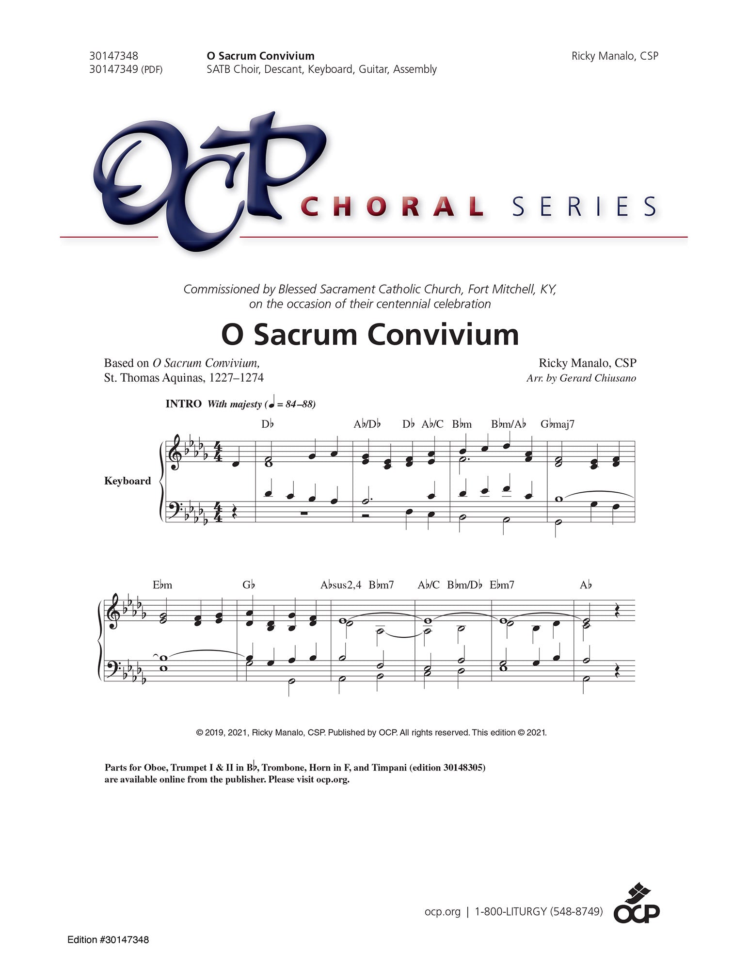 With text based on the antiphon to the Magnificat of Evening Prayer for the Solemnity of Corpus Christi (attributed to St. Thomas Aquinas), augmented by additional writings from St. Paul and St. Augustine (_x001C_ may we become what we receive_x001D_ ), Manalo has crafted a Communion song that is both beautiful and catechetical. It is scored for SATB choir with descant accompanied by keyboard and guitar. Its foursquare melodic rhythms, stately harmonic progressions, and the Latin incipit _x001C_ O sacrum convivium_x001D_ of the refrain text give this piece a kind of timeless majesty that reminds us not just of the solemnity of the sacrament but the call to action contained therein.