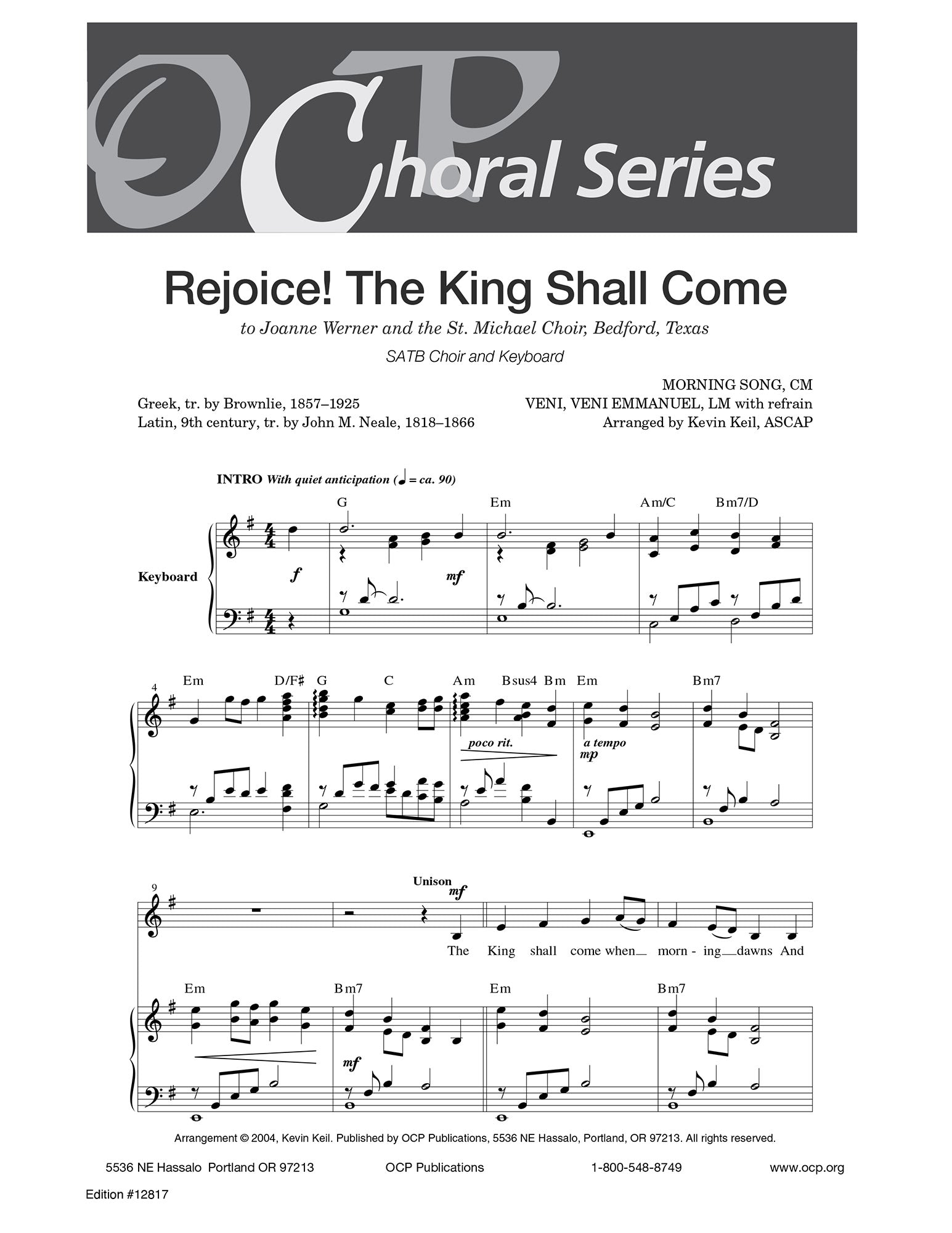 Clever and effective, this combination of two well-known hymns (MORNING SONG and VENI, VENI EMMANUEL) will fit thematically into almost any Advent celebration. The reharmonization of the hymn tunes in this arrangement, scored for SATB chorus and keyboard, is often striking and surprising and will certainly add new life to these venerable hymn tunes. Although not necessarily intended for assembly participation, the congregation will nevertheless follow the lyrical content through their familiarity with these well-known hymn tunes and texts.