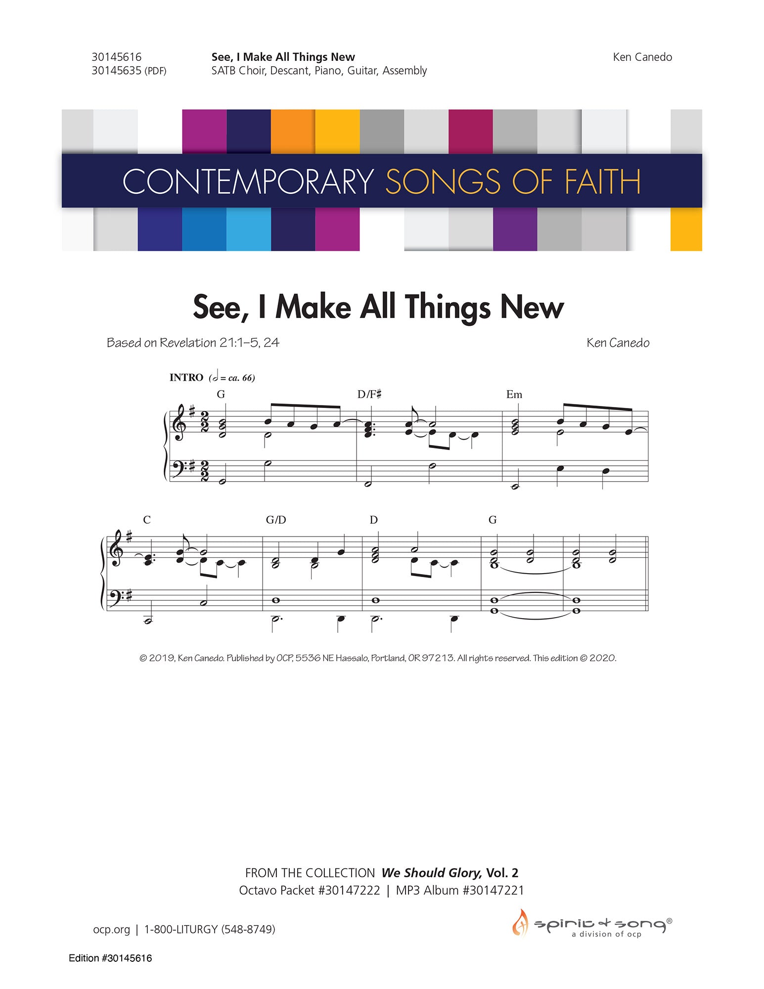 With a catchy, lightly syncopated refrain this singable assembly song is sure to be quickly embraced by your congregation. With lyrics based on Revelation 21:1_x0013_ 5 and dealing with topics of comfort, eternal life, faith, healing, unity, and the kingdom of God over its three verses, this song is especially appropriate during the season of Easter. It is scored for SATB choir and descant with piano and guitar accompaniment.