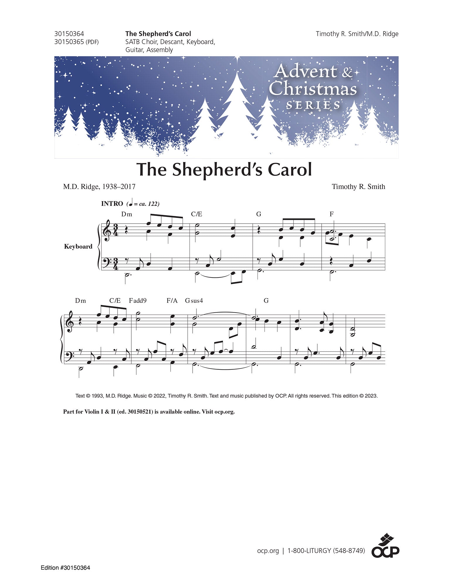 In this octavo, Smith_x0019_ s musical setting of Ridge_x0019_ s text deftly captures the perspective of the shepherds who were visited by the angels heralding the coming of the Christ Child. Each of the five verses has three rhyming lines, the simplicity of which helps to underscore Jesus_x0019_ s humble arrival at Bethlehem. The plaintive and beautiful minor-key setting is scored for SATB choir with descant, accompanied by keyboard and guitar. Separately downloadable parts for string quartet are available at ocp.org.