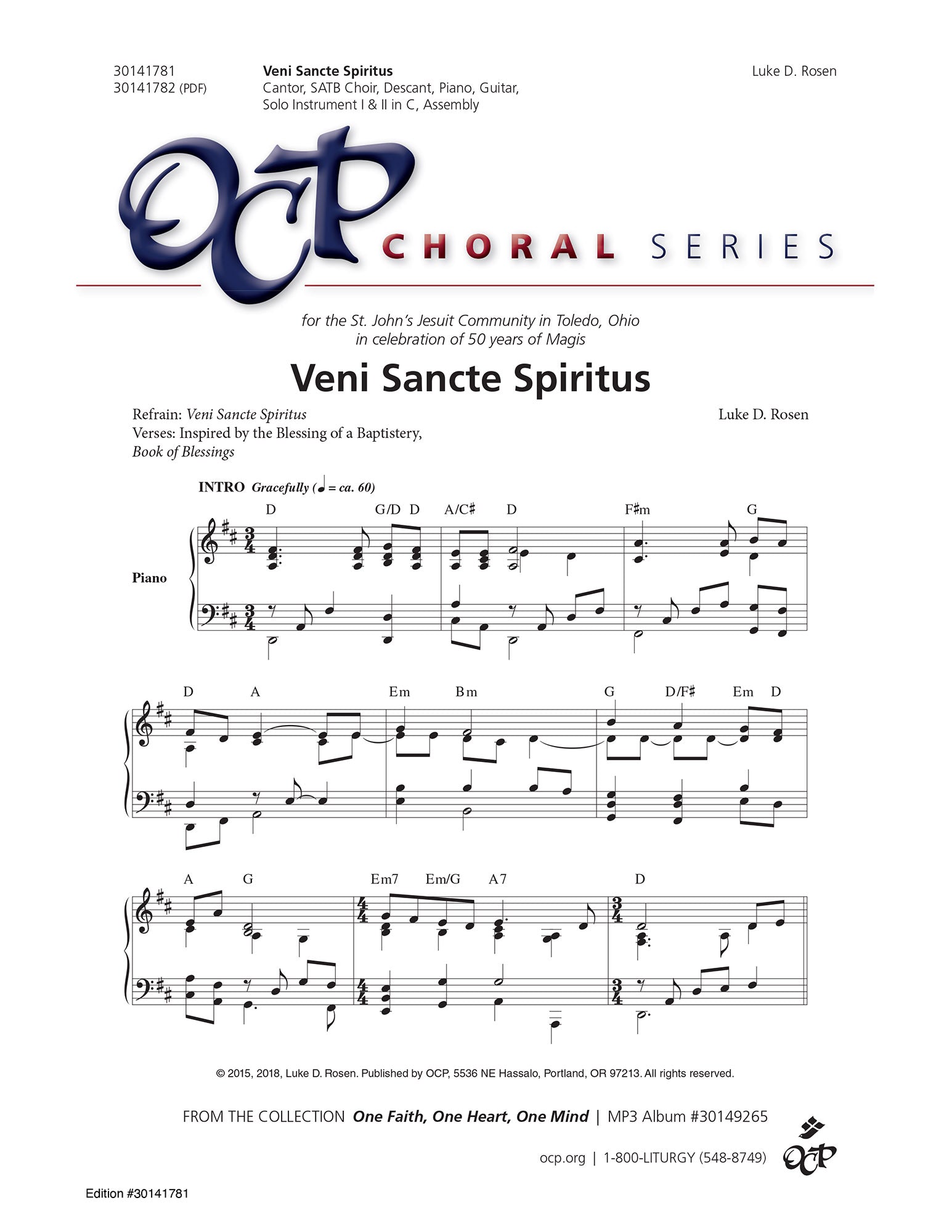 Ideal for celebrations of baptism or confirmation, this heartfelt appeal to the Holy Spirit is scored for SATB choir with descant, piano, guitar, and two solo instruments. The Latin refrain is paired with three English verses, all of which will be easily sung by the assembly.