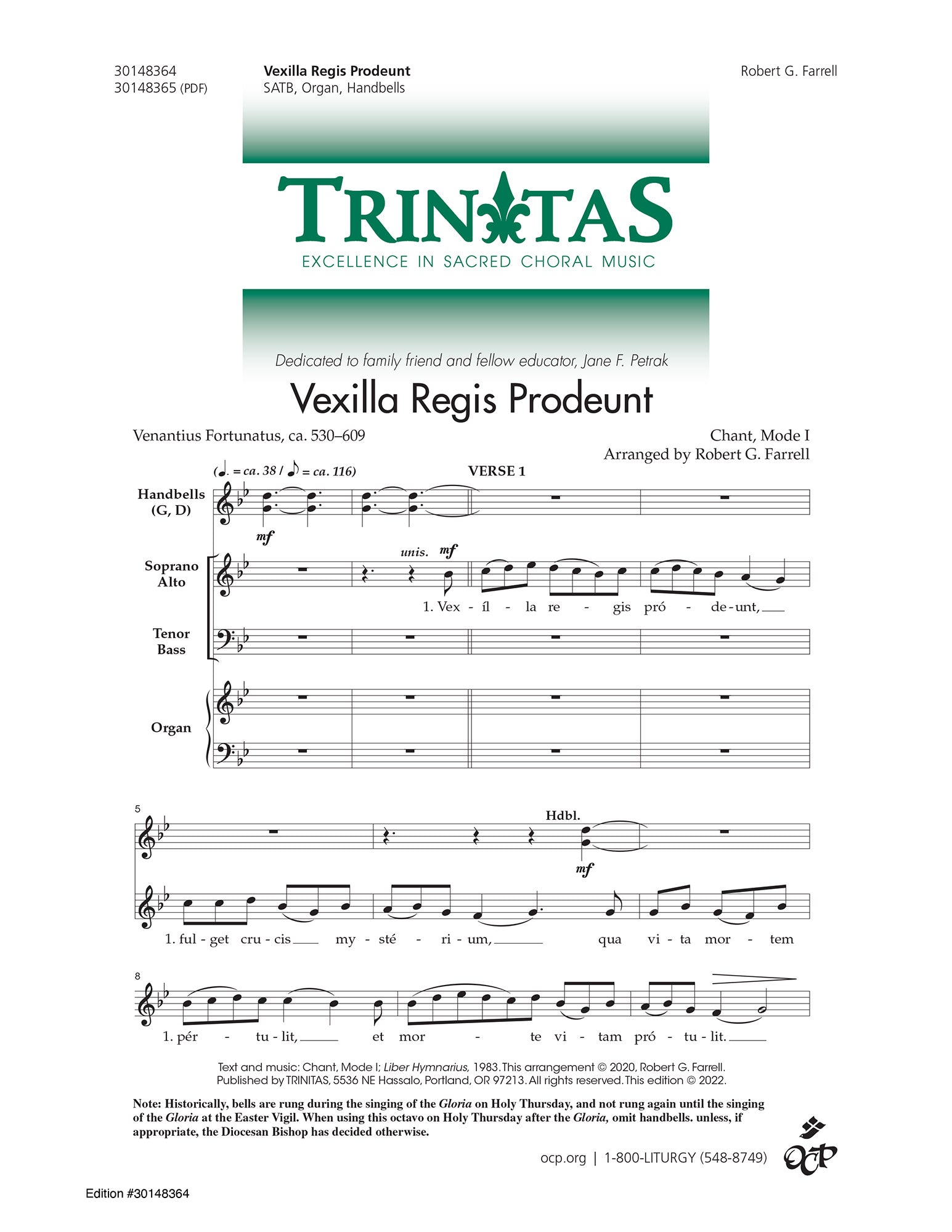 This arrangement of the venerable 6th-century chant is scored SATB choir, organ, and handbells (although only two bells are needed for the drone-like open fifth). Because this is based on a plainchant but uses modern notation, the unmetered and unpredictable note groupings will require some advance preparation by the choir, its director, and the organist to ensure proper ensemble. It is moderately difficult, but the end result is effective and worth the effort. This piece is especially appropriate for the Exaltation of the Holy Cross (September 14) and for Holy Thursday. When used on Holy Thursday, be aware that the handbells should be omitted when sung after the Gloria (as not bells are used again until the singing of the Gloria at the Easter Vigil).